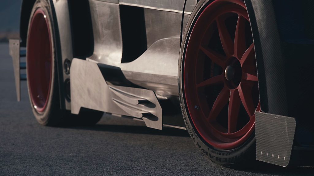 車頭前端也有增加空力套件,輪拱也裝上碳纖維材質寬體並且附有通風孔,側邊則是可以觀察到寬體側裙。令人感到意外的是,這輛賽車也使用了側排設計,讓人感受到濃厚的熱血氛圍。同時,車內的中控台儀表板也都已經被卸下,換上賽車用的儀表板,僅提供駕駛必需要知道的資訊。