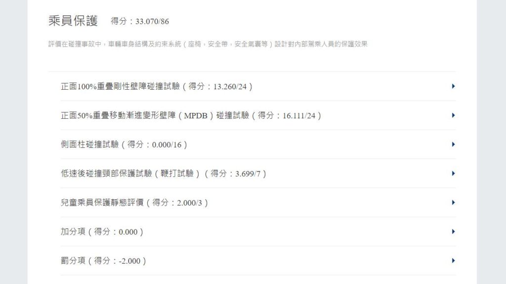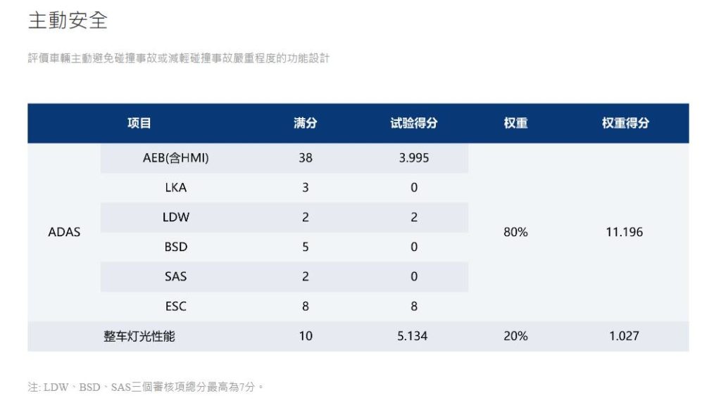 而在主動安全測試項目,官方網站雖然很強調ADAS系統,但因為沒有BSD盲點偵測,直接先少掉5分,而LKA車道維持輔助與SAS速度輔助系統作動表現不佳,一樣拿不到分數;最關鍵的就是AEB測試,滿分38分竟然只拿到3.995分,絕大多數測試情境幾乎都無法順利避免碰撞發生,成為此項目只有30.26%的主因。