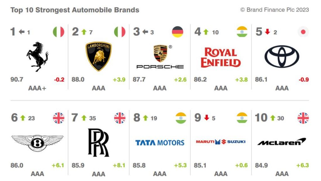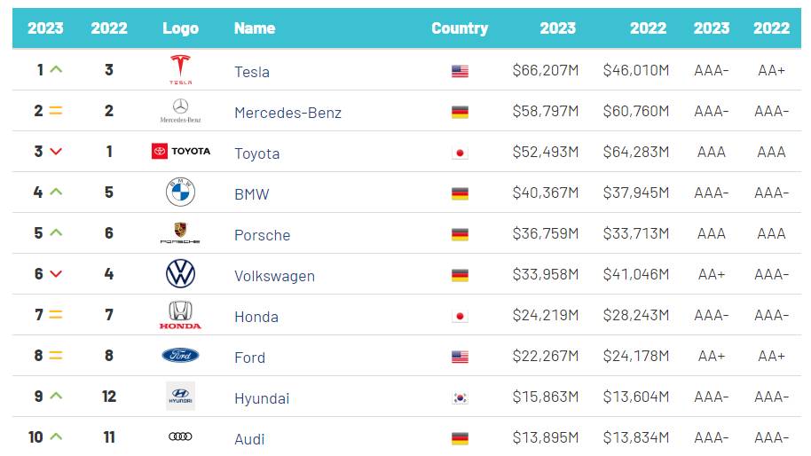 若以汽車品牌的前10名來看,除了Mercedes-Benz、Honda與Ford維持與2022年相同名次,分佔2、7、8名之外,其他名次都出現了洗牌。2022年的第9、10名本來是Nissan、Volvo,但在2023年卻跌落至11與15名,Toyota(品牌價值524.9億美元)及Volkswagen(品牌價值339.6億美元),兩大品牌也都出現名次下滑,分別從1、4名下滑至3、6名;其餘如Tesla、BMW、Porsche、Hyundai與Audi,則從2022年的3、5、6、12、11名,進步至1、4、5、9、10名。