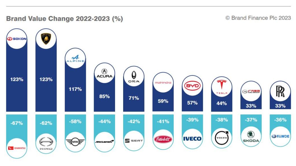 再看到2023年品牌價值成長與衰退幅度前幾名的車廠,成長最高的是Lamborghini及來自中國的Sokon,成長幅度達到123%,所以前者排名由49名進步至27名,後者也從99名攀升至83名;另外,登頂的Tesla,也是憑藉44%的成長幅度,才能力壓Mercedes-Benz及Toyota,至於超豪華品牌勞斯萊斯,成漲幅度也高達33%。