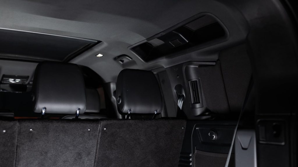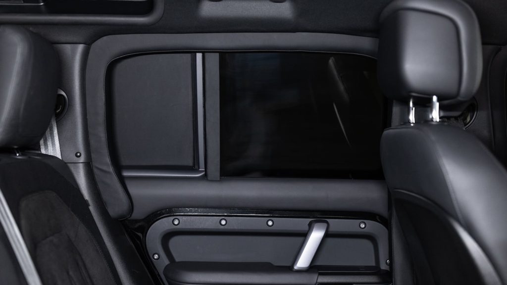 令人感到意外的是,經過改裝升級之後的防彈Land Rover Defender從外觀上是幾乎看不出來與一般車輛的不同,可以說是相當低調。但是進到車內之後就會發現還是有很大不同,包含後車窗是不能夠開啟,天窗也被防彈裝甲給遮蔽。但即便在這樣的狀況之下,還是能保有車上寬裕的乘坐與置物空間,因此在機能性方面其實並沒有打太多折扣。