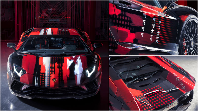 山本耀司並未更動Aventador S外觀造型,而是運用這款V12超跑作為揮灑的畫布,將個人設計概念注入其中。可以看見山本耀司運用紅、白、黑三色為這輛Aventador S繪上大膽且狂野塗裝,並點對日文與漢字元素,例如車頂的「文明開花」、車側「呵呵呵呵」與「呵呵大笑」,還有車尾「百發百中」等,並在前葉子板留下山本耀司「Yohji Yamamoto」英文簽名。