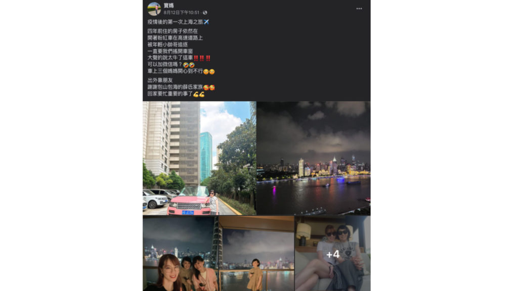 藝人「寶媽」最近和姐妹到上海旅遊,並開心地在粉絲團貼文和網友分享美照。寶媽還在貼文中寫道:「這疫情後的第一次上海之旅,四年前住的房子依然在,開著粉紅車在高速道路上,被年輕小帥哥追逐,一直要我們搖開車窗,大聲的說太牛了這車。可以加微信嗎?車上三個媽媽開心到不行」。網友們看到貼文之後紛紛回覆:「三位媽媽都太美了」、「人美真好啊!」、「珍惜美好的時光!盡情享受」。