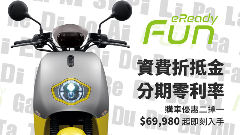 eReady五月持續推出「eReady Fun資費折抵Fun膽專案」,不只現金購車就送5,000元折抵金、或信用卡購車祭出36期零利率,日付69元~82元起,銅板價即可輕鬆入主!以上方案皆再贈「安耐曬防曬組」,讓民眾疫情期間選擇騎車出門的時候,也不怕夏季烈日曬黑曬傷。