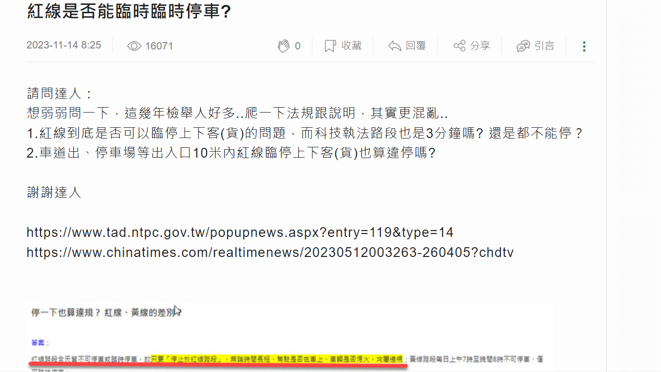 近半年來有關於違停與臨停記點新制等相關議題,一直都是大家很關注的問題,不管怎麼改都有許多反對聲浪出現,交通部希望可以商討出比較折衷的方式,於是政策一直都在做滾動式調整,造成許多人都不太清楚現行法規究竟是怎麼樣執行,日前就有網友在論壇上提出疑問,紅線到底可不可以臨停?吸引許多網友在底下分享自己的看法。