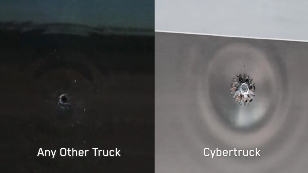 如果車體不是用上當代車壇中罕見的不銹鋼、而且還是超硬Ultra-Hard 30X不銹鋼材質,讓特斯拉不得不引進全球最大的9,000噸級沖壓機來製造,否則Cybertruck的問世時間可能會比2023年還要更早吧?在Cybertruck的交車典禮現場,特斯拉就放出了俗稱Tommy Gun的.45口徑湯普森衝鋒槍(Thompson submachine gun)、M4散彈槍、9mm子彈的Glock克拉克手槍與同樣是9mm口徑的MP5-SD衝鋒槍一次三款實彈測試影片!可以看到Cybertruck的Ultra-Hard 30X不銹鋼車體幾乎都能吸收跟分散子彈的衝擊力道,並沒有讓子彈穿過車體進到車室內危及到乘員安全。