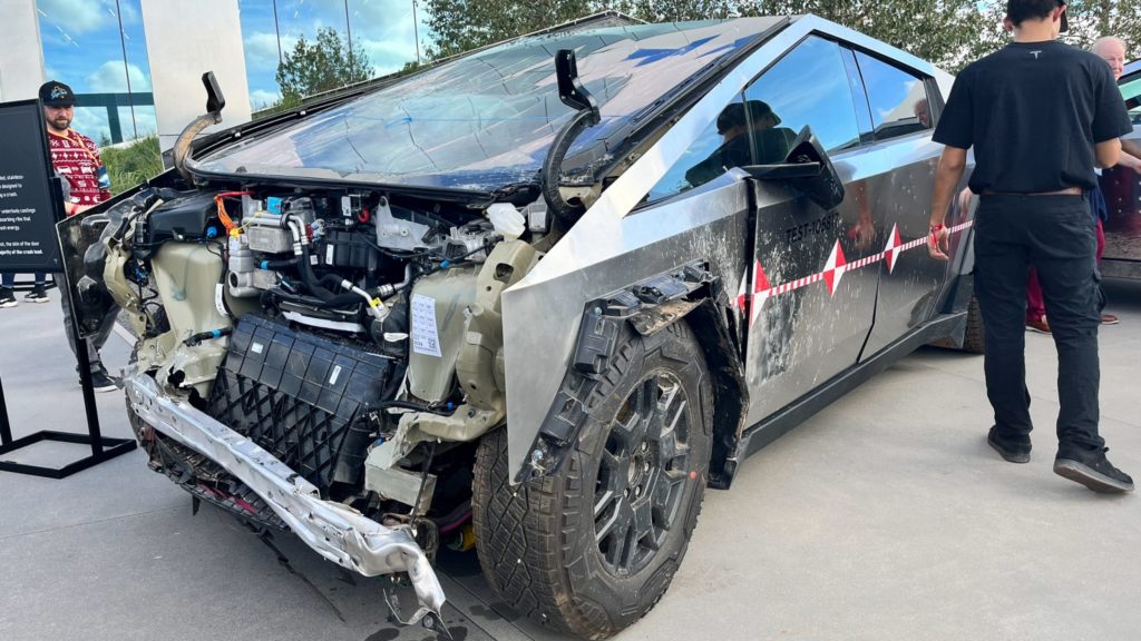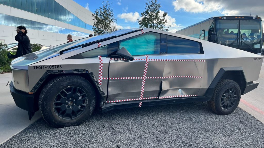 不過必須持平地說,Tesla釋出的防彈影片測試方法其實跟目前防彈車款主流採用的VR6或是VR9等級認證不盡相同,後者是以7.62mm步槍子彈射擊與手榴彈等爆裂物攻擊作為防護基準,是各國政府採購首長/警政座駕的標準依據;雖然特斯拉電動皮卡不是認真的「防彈」車,但相信對車內乘員的防護力已經是當前普通市售車的頂標了!另一個跟防護力息息相關的還有被動安全,特斯拉同樣在交車典禮會場外展示了接受撞擊測試的Cybertruck樣本,無論是在前撞或是側撞測試時後的電動皮卡,A柱到C柱的生存空間都很完整,而在超硬不銹鋼的加持下車殼潰縮程度也不若其他車款那麼明顯。