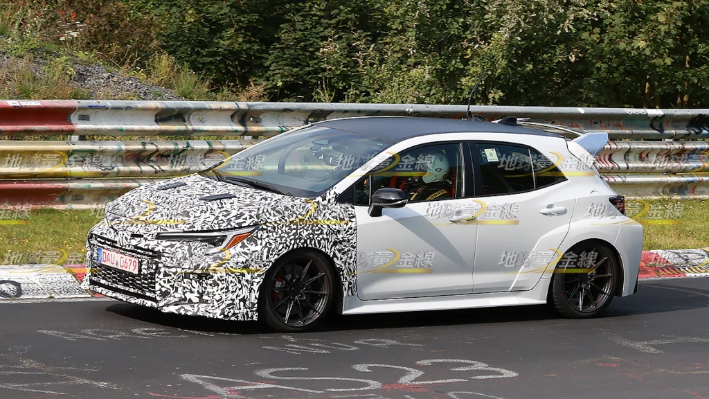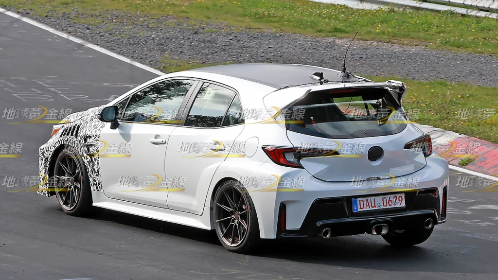 Toyota似乎已經成為日系汽車品牌中最具熱情的一個!近日《地球黃金線》合作夥伴於德國Nürburgring北賽道捕捉到一輛前保桿覆蓋偽裝的GR Corolla正在進行測試,且這輛偽裝測試車不但換上與小改GR Corolla相似的前保桿,還在葉子板裝上概念接近911 GT3 RS的散熱鰓孔,甚至裝上更大尺寸的後尾翼。外界推測,這很可能就是Toyota正在為性能更狂放的GR Corolla車型進行測試的證據,甚至有望就是GRMN Corolla的偽裝測試車。