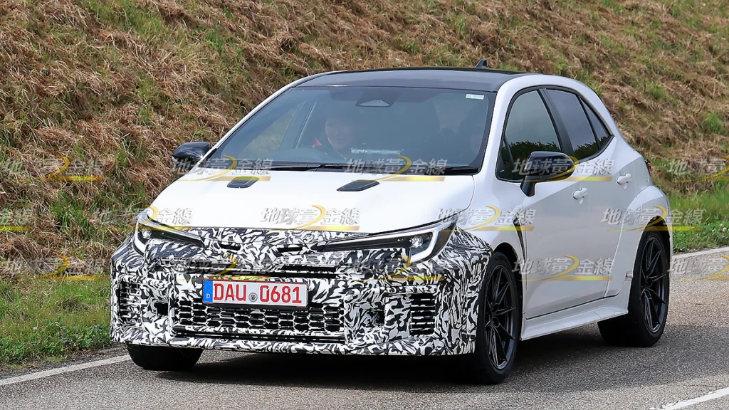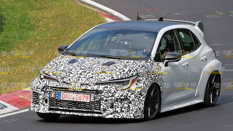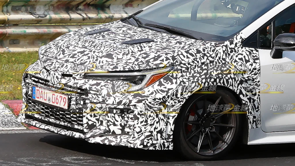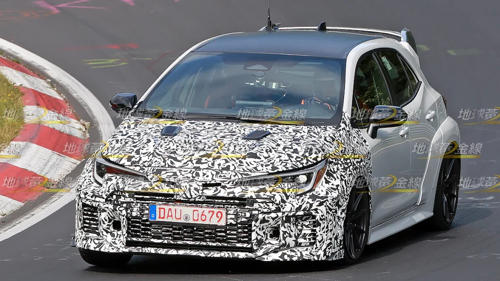 而且,在疑似英國規格右駕GR Corolla之外,德國Nürburgring北賽道還有一輛更熱情的GR Corolla原型車正在進行測試。雖然同樣都在前保桿包覆偽裝,但依稀可見前葉子板輪拱上方出現與911 GT3 RS相似的空力鰓孔,前輪拱後方的氣流通道開口也明顯放大,並換上更具侵略感的格柵設計,甚至前霧燈也可能被取消,以利增加進氣量,透露這輛車的性能可能與標準GR Corolla有所不同。