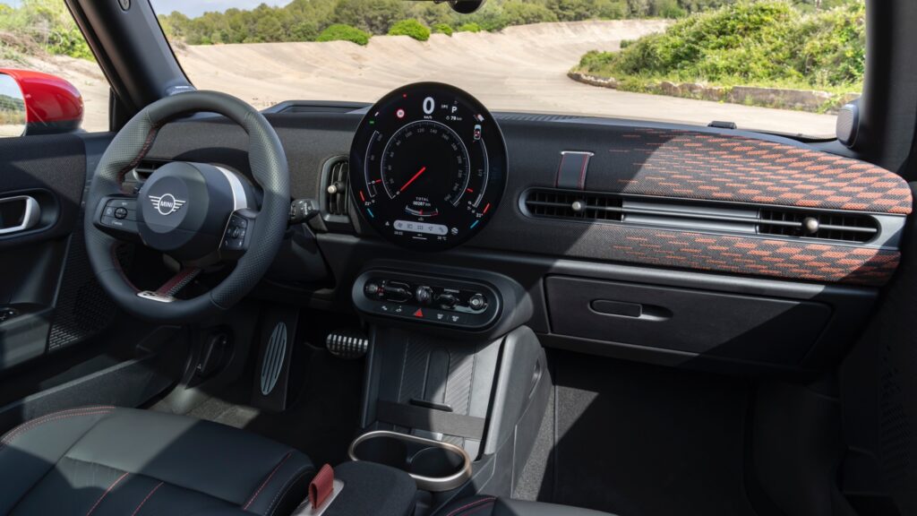 車內設計延續Mini新世代風格,搭載24公分直徑的OLED螢幕呈現高解析度顯示,配合Harman Kardon音響系統,打造視聽感官雙重享受。JCW的內裝採用紅黑配色,搭配跑車化座椅,黑色合成皮結合紅色車縫線,不僅營造出運動氛圍,也提供良好的支撐性與舒適度。