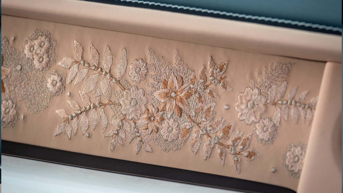 Phantom獨有的「Gallery」中控台設計,是專為展出訂製藝術作品而設的空間,而在Dentelle上,這幅藝廊級刺繡作品融合八種刺繡技法與多層次繡線密度,運用Rose Gold玫瑰金、Sunrise曙光金、Oatmeal燕麥色等色調,呈現出花瓣、蕨類與蕾絲網紋的立體質感,底層以三道縫線構成細緻網格,再以緞面刺繡勾勒花型,搭配如珍珠般的凸起元素,在光影交錯下展現夢幻閃耀的視覺效果。