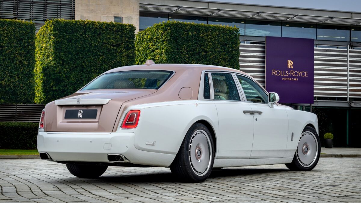 Phantom Dentelle車身外觀同樣承襲細緻優雅的蕾絲精神,採用Crystal over Arctic White與Crystal over Palais Nemasker Dawn雙色塗裝,其中後者為該名客戶專屬顏色,其他人無法選用,手工繪製的雙道coachline車身線條,最終以描繪珍珠果實與枝葉的圖案收尾,呼應車內主題。22吋全拋光Disc輪圈搭配與車身同色的輪圈中心蓋及白色細緻輪圈線,增添華麗感,Pantheon格柵經手工拋光處理,其頂部則擁有玫瑰金打造的Spirit of Ecstasy女神像,門檻踏板上也刻有玫瑰金鑲嵌字樣,極盡奢華之能事。