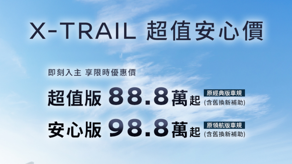 針對重視主被動安全與科技配備的家庭用戶,Nissan同步推出X-Trail「安心版」,原建議售價為115.9萬元,在限時優惠下最低入手價為98.8萬元(含舊換新補助),讓消費者以不到百萬元的價格,即可享有旗艦級的安全科技與便利配備。