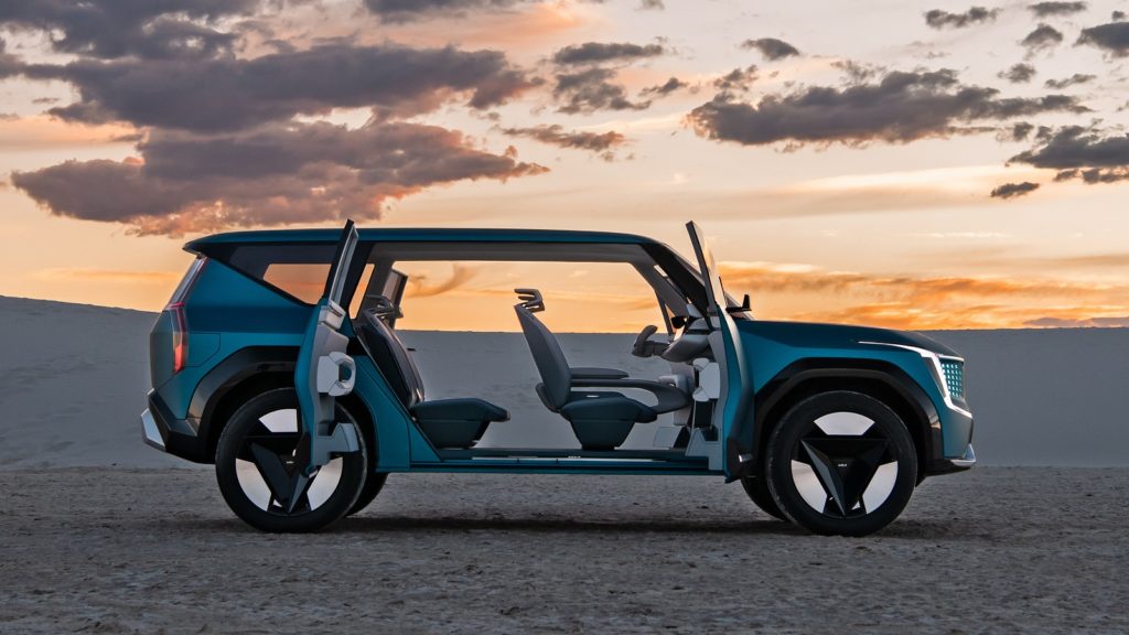 雖然EV9外觀氣勢驚人,車長4,930mmt、車寬2,055mm、車高1,790mm尺碼還比現行Carnival略小,介於Carnival與Sorento兩款強調空間機能的作品之間。但是,受惠於電動車優勢,EV9軸距長達3,100mm,甚至比起最多可植入11人座的Carnival更長,確保了EV9的空間基礎。Kia還為EV9導入對開式車門配置,創造更廣闊車室開口,搭配全景玻璃車頂,還有直挺、方正車身輪廓,建立出色的空間基礎。