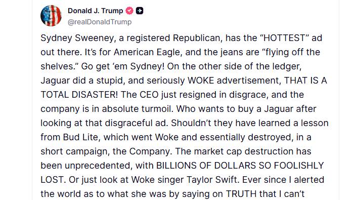 8月4日川普在Truth Social平台上發文,將Jaguar與美國品牌American Eagle的廣告進行對比。他盛讚American Eagle的牛仔褲廣告,稱其為最火爆的廣告。而對於Jaguar的廣告,川普則毫不留情地批評,稱為「一場徹底的災難」,該廣告以多元文化為主題,也未展示任何汽車,或Jaguar標誌性的豹頭標誌。他更直呼「這可恥的廣告導致Jaguar陷入絕對的混亂,前執行長因此離職。」不過,JLR強調,前執行長Adrian Mardell的退休與廣告爭議無關,屬於長期計劃的一部分。