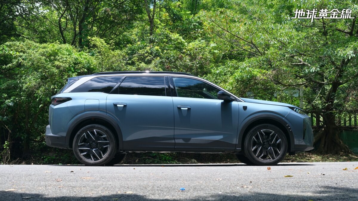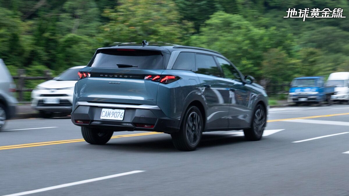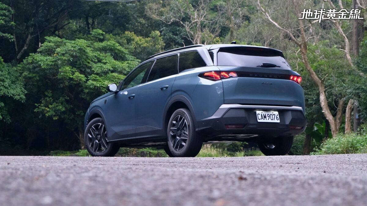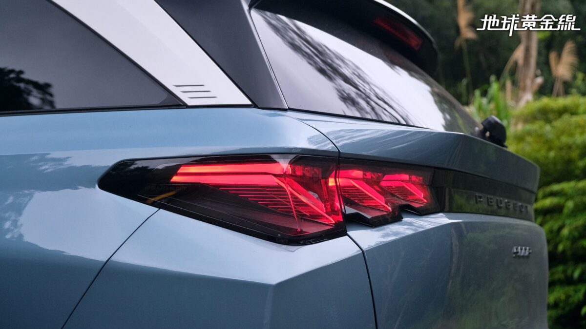 此外,為了容納第三排座椅、擴大行李廂空間,5008 Hybrid並不像3008 Hybrid採用短後懸設計,而是將後懸拉長,搭配回歸標準SUV設計的車尾造型,整個車身比例看起來更協調,車側也因為隱藏式車窗水切條跟B柱、C柱採用黑色鏡面塗裝,視覺上顯得較為流暢。