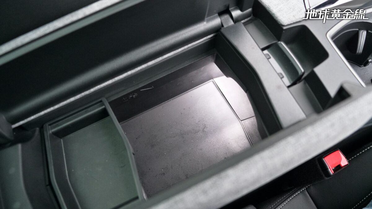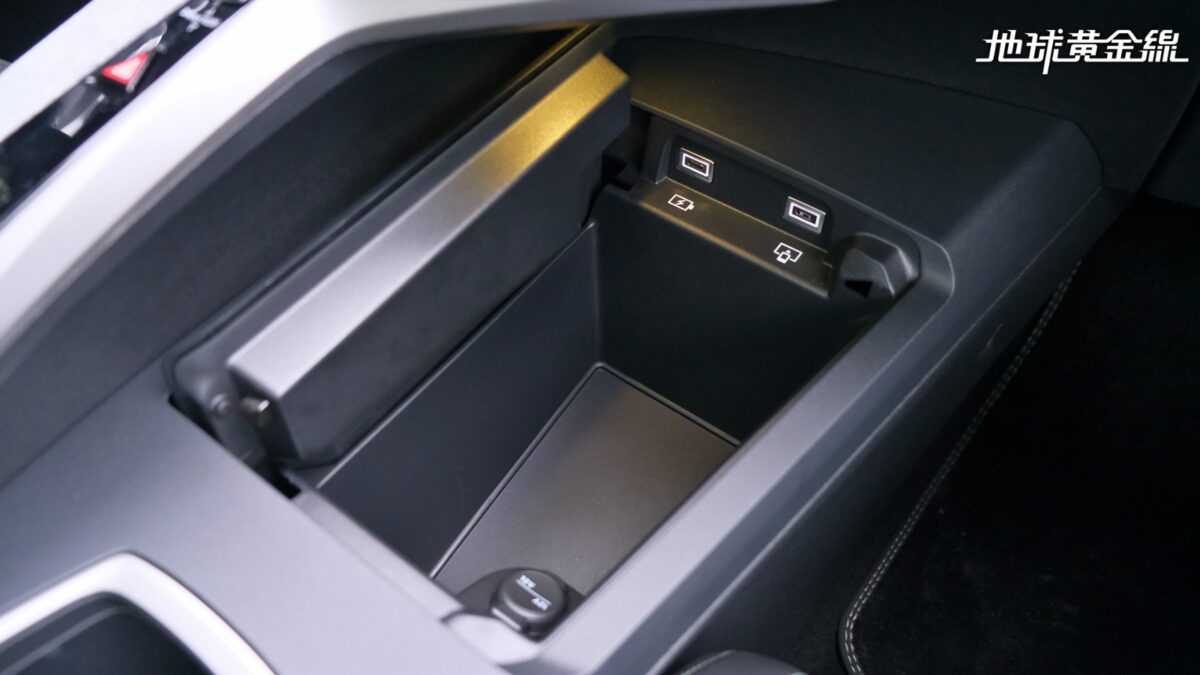 視線移往不對稱設計的中央鞍座,在這裡可以發現有一些滿貼心的收納設計,例如中控台下方有手機無線充電座,還有內建兩組USB充電孔跟12V電源插座的置物盒。位於前座中央扶手內的置物箱則是內建空調出風口,透過溫控功能可以用來保冷或是保溫,而且內部空間相當深,就算要多放幾罐飲料也是沒問題。