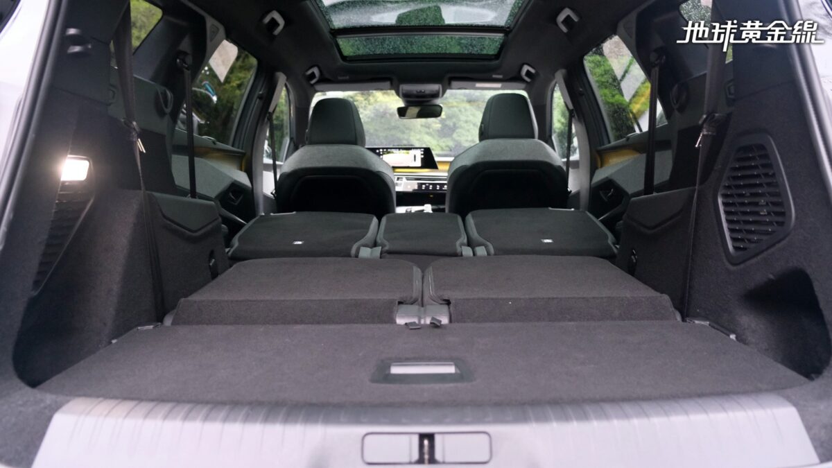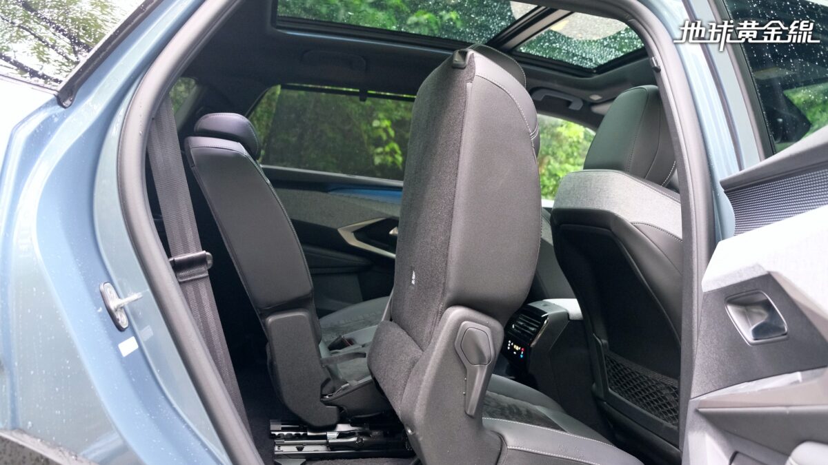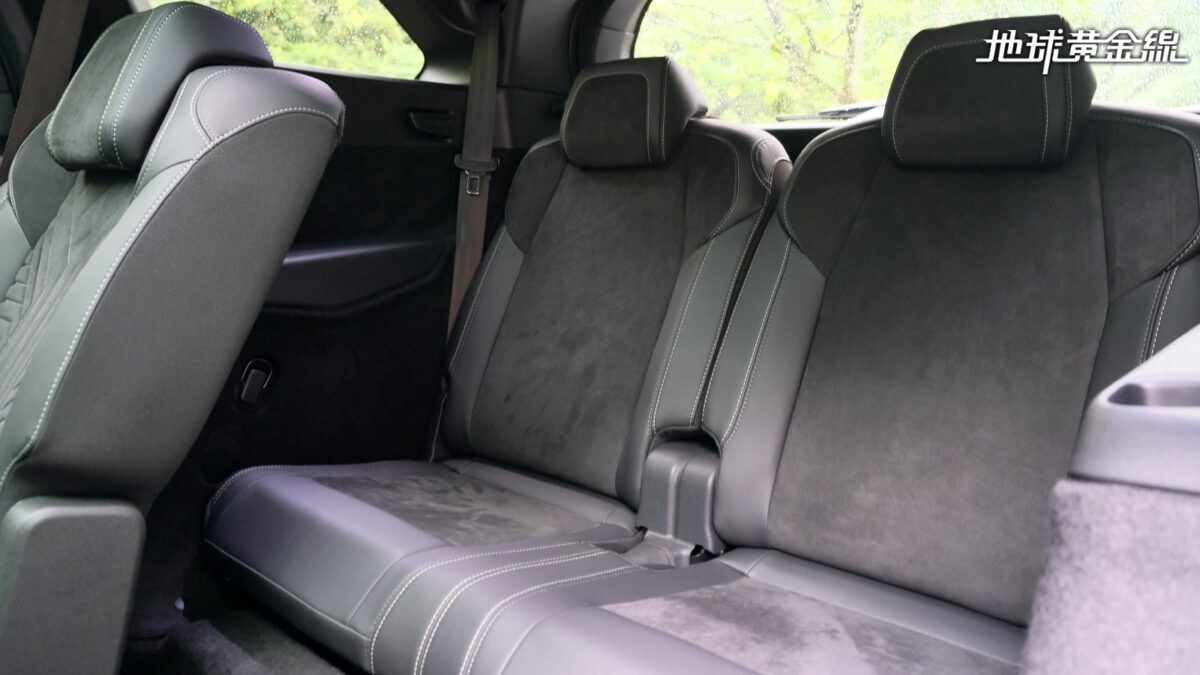 令人印象深刻的還有第二排座椅具備快傾功能,只要簡單的一個動作就能將整張座椅拉起往前傾,讓第三排乘客能夠更輕鬆地上下車。實際坐進第三排也能發現,其實空間表現還不錯,以自己的身高174公分為例,頭部跟車頂之間仍有大約2指幅的距離,將第二排座椅固定在中間位置時,膝蓋也不會頂到第二排椅背。雖然第三排座椅屬於「5+2 」座設計,但實際乘坐仍具備一定的舒適性,比較可惜的是椅面高度偏低,大腿內側會有些懸空,長時間乘坐可能會稍微影響到舒適性。