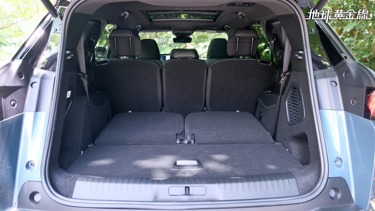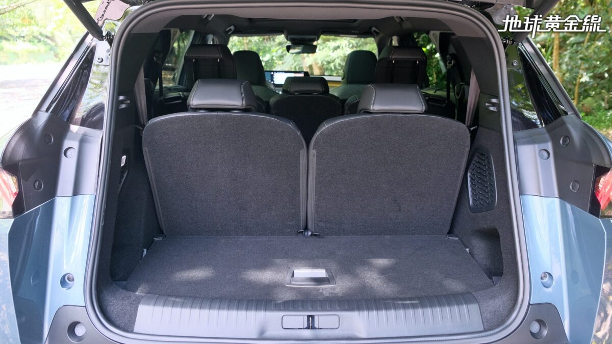 打開全車系標配的足踢感應式電動尾門,大改款5008車身拉長的優勢一覽無遺,即使在7個人坐好坐滿的情況下,行李廂容量依然有348公升,如果將第三排座椅打平,便能擴充到916公升,如果再將第二排座椅也打平,更能一舉擴充至2,232公升,而且座椅打平後還算平整,無論是作為車宿空間或用來裝載大型物品,都能展現出空間運用上的彈性。