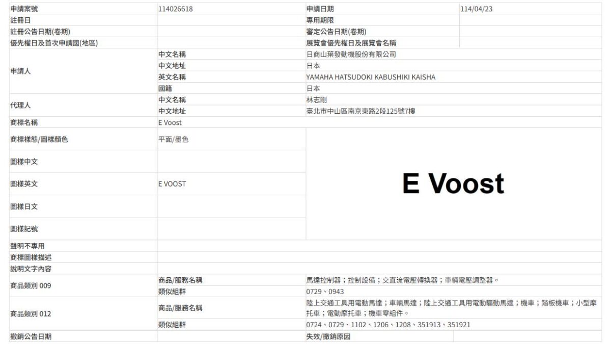 此外,Yamaha申請的是「快軌案」,要知道一般商標申請案審查時間約需要6個月或更久,而如果是「快軌案」,則審查時間會加快1.5個月,意即有機會在3.5~4個月左右取得官方審查結果。假如E Voost是要搭載在Cygnus XR 155的新專利技術的商標,推測可能就是因為整個作業來不及在9月4日上市前全數完成,所以才會要到年底才能上市或交車?