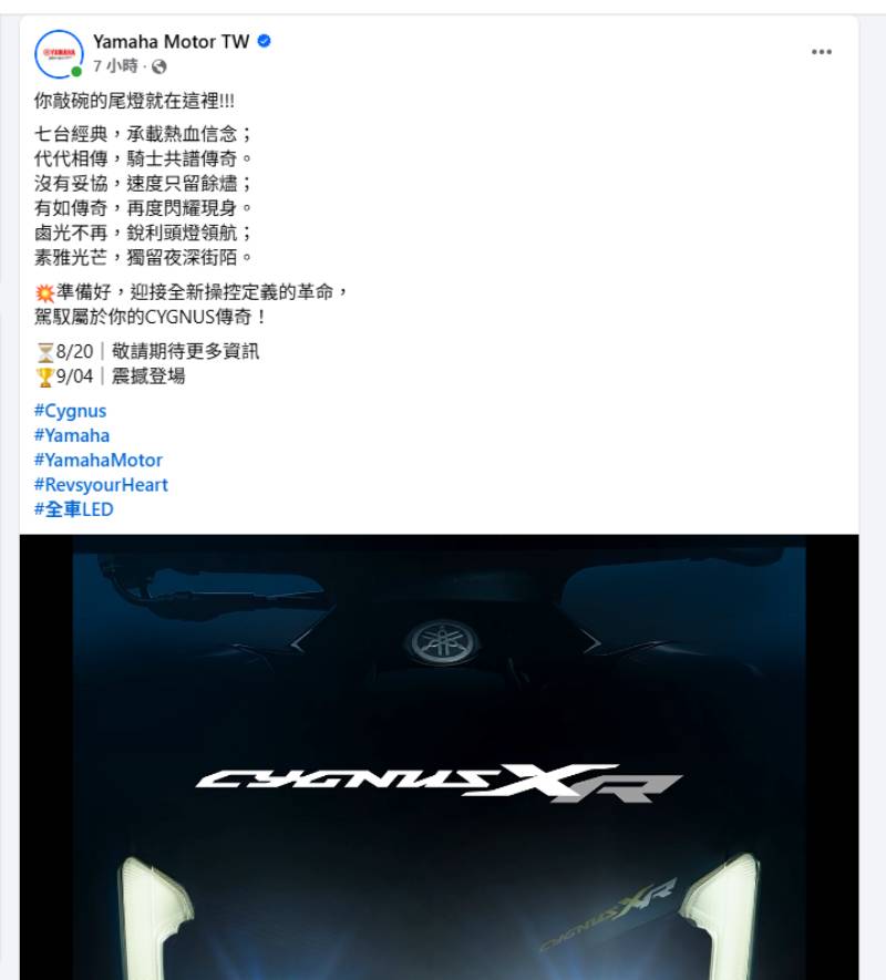 Yamaha Motor TW臉書粉專的小編大玩創意,透過藏頭詩來傳達「七代沒有鹵素」,等於是全車系將改搭LED頭尾燈與LED方向燈。從影片的燈型來看,尾燈模樣已經讓不少車迷留下深刻印象,至於頭燈則似乎是用上汽車級的魚眼,再加上兩側的直列LED定位燈條,方向燈位置預估是回歸設計在龍頭上。至於前斜板靠近左燈的上方,則有Cygnus XR的貼紙(或銘牌?)。
