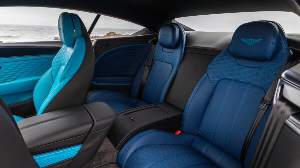 車室同樣延續漸層理念,前座以Topaz皮革包覆座椅、方向盤與儀表板,中控台向後過渡至深色Beluga皮革,營造層次感。座椅與車門縫線特別加入Dragonfly 藍色點綴,進一步強化奢華氛圍。此外,車內也配備了Bentley Rotating Display、Naim for Bentley高階音響系統,以及第四代Continental GT才引進的Dark Chrome內裝套件,將現代科技與傳統工藝完美融合。