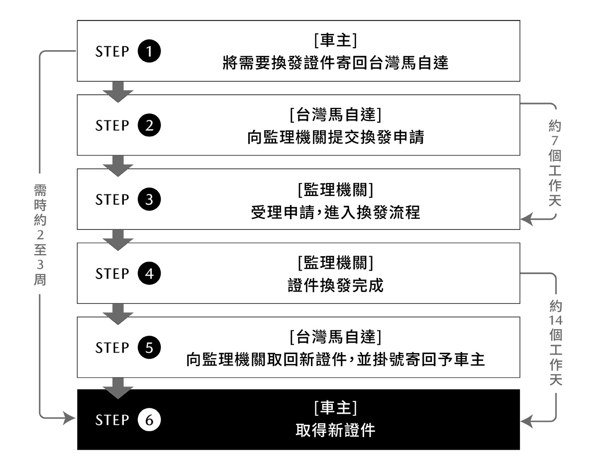 除了郵寄方式以外,車主也可選擇自行前往全台任一監理站申請證件換發,相關申請規費將由台灣馬自達負擔。完成換發後,再攜帶新證件及繳費收據至經銷據點,即可領回申請規費。