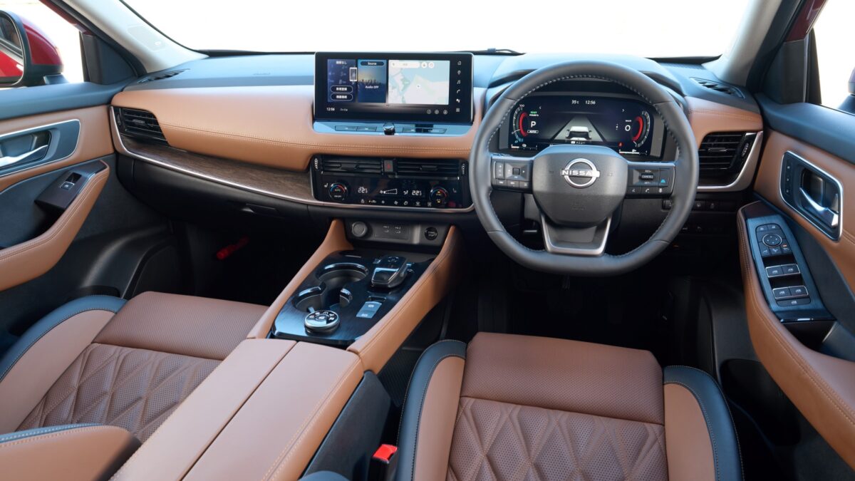 小改款X-Trail大致延續改款前的內裝設計,但儀表台上半部改為黑色,前後座USB充電插孔全部改為Type-C規格,同時保留了雙層設計的中央鞍座,中控台下方備有手機無線充電座,高階車型才能選配的Nappa皮革內裝則是從褐色改為棕色,前座椅側邊特別加入黑色皮革來呼應雙色內裝鋪陳,另外也有全黑鋪陳的Nappa皮革內裝可選,部分車型還提供第三排座椅,組成5+2設定的7人座佈局。