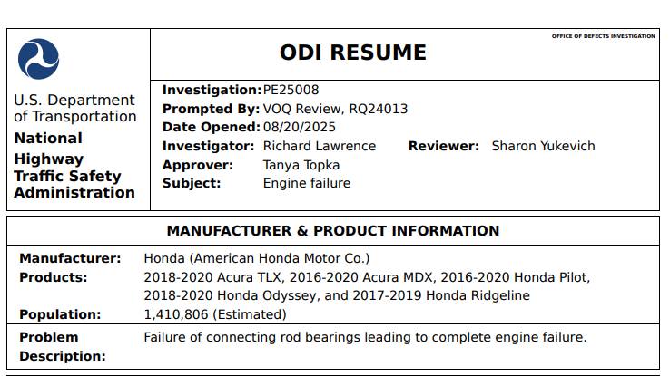 美國國家公路交通安全管理局 (NHTSA) 日前宣布,由於收到多起引擎故障投訴,將對超過140萬輛Honda和Acura展開初步調查。這些故障與連接桿軸承有關,嚴重時恐怕會造成引擎嚴重損壞。雖然目前沒有因故障釀成傷亡的通報,但NHTSA表示,將評估問題的範圍和嚴重性,以確認是否存在潛在的安全風險。這次調查的車型多達1,410,806輛,涵蓋2016至2020年式的Honda Pilot,及Acura MDX等車款。