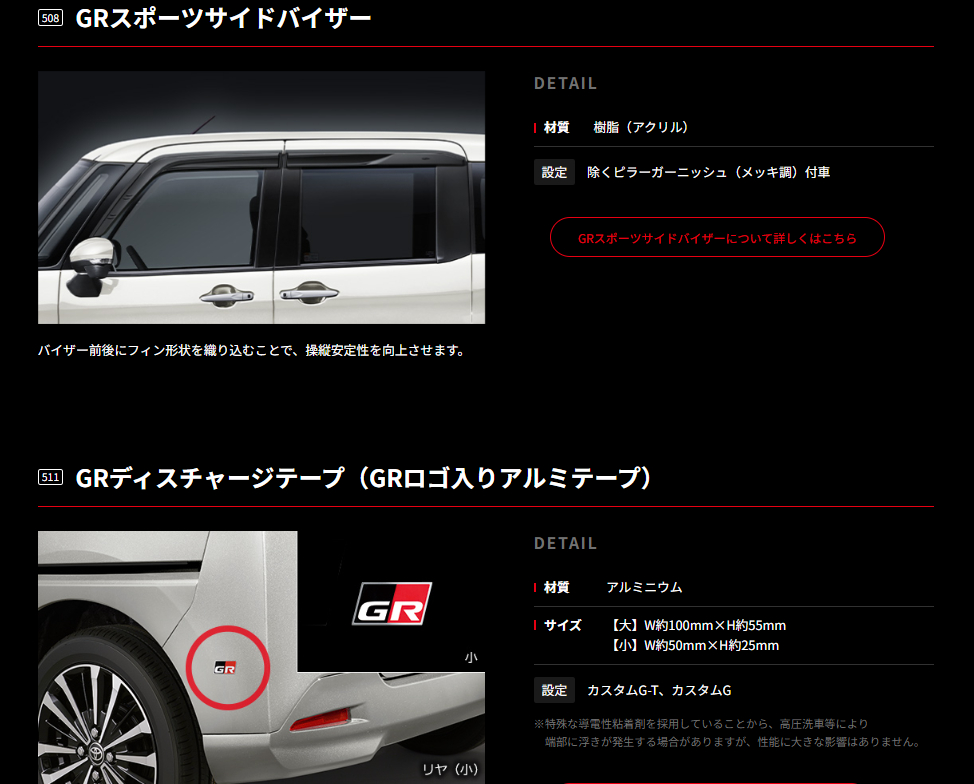 此外,Toyota GR也為Roomy推出諸多的改裝周邊,包括帶有GR字樣的改套裝飾、碳纖維車牌框還有GR運動化晴雨窗等配備,甚至還有GR貼紙可供購買,另外在門把手位置則還可以選購碳纖維保護飾板。原廠強調,晴雨窗與貼紙並非中看不中用,前者有設計導流翼片,可以加強過彎穩定性,後者則有去除車身靜電之效果。
