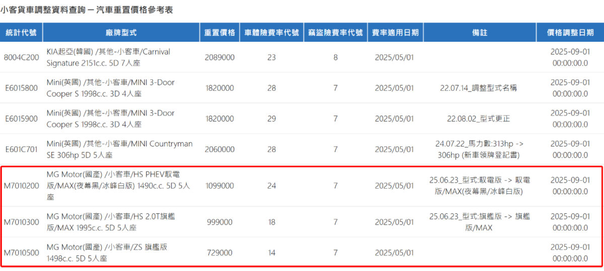 但是,最近出現在保發中心的新車調整資料中,卻出現HS PHEV、HS 2.0T跟ZS 1.5L旗艦版之重置價格有明顯變動狀況。當中標明HS PHEV重置價格為109.9萬,HS 2.0T為99.9萬,ZS 1.5L旗艦版為72.9萬元,與官網標示的車款售價有所出入。外界推測MG Taiwan擬對車款降價,不過經過了解,該價格僅是將心動購車金列入的溝通結果。