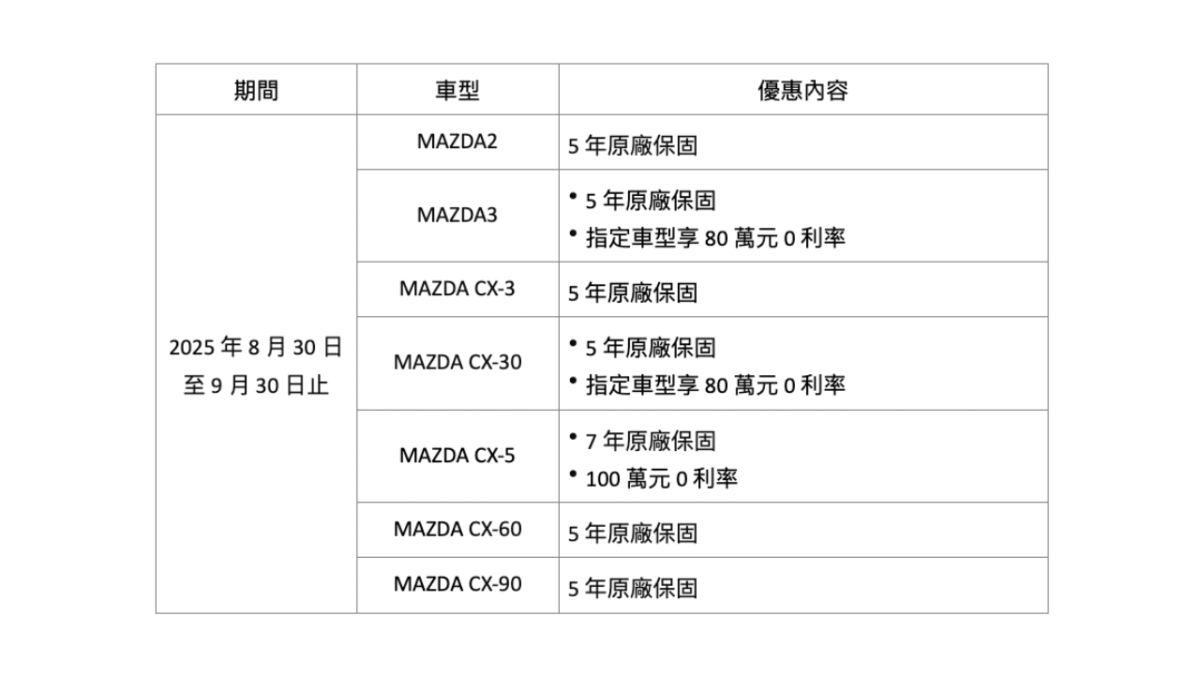除了針對CX-5的加碼方案外,台灣馬自達也同步推出多款車型的購車禮遇,以回應不同族群的多樣化需求。旗下掀背小車Mazda2與中型房車Mazda3,在9月購車即可享有5年原廠保固,其中Mazda3指定車型更提供80萬元0利率,讓年輕首購族群更易入手。