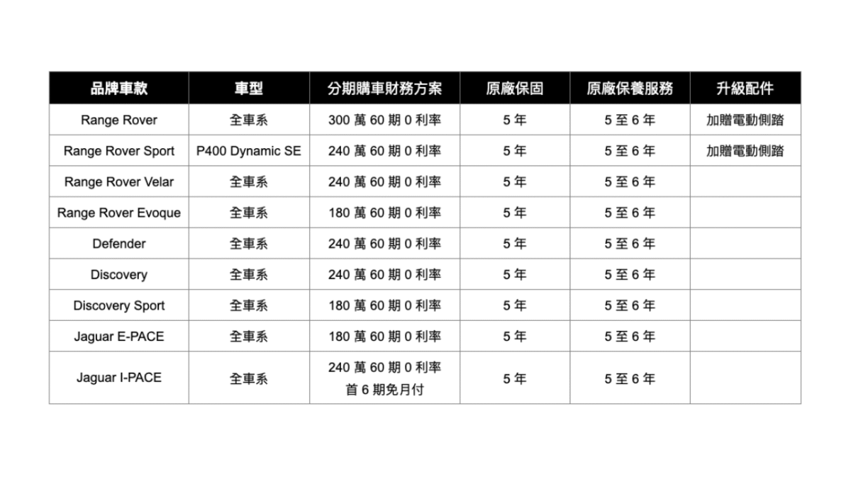 其中,Range Rover與Range Rover Sport P400 Dynamic SE更在上述優惠基礎上再度升級,限時加贈「電動側踏」,不僅提升日常使用的便利性,也進一步彰顯Range Rover家族豪華休旅的尊榮氣度。