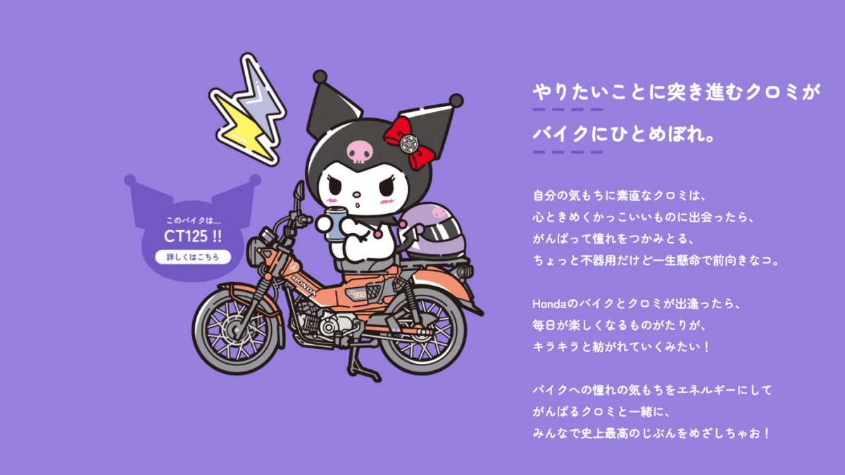 Honda此次特別打造專屬活動網頁,粉絲可以在其中欣賞到以酷洛米為主題的特別車款,包括復古潮流代表Honda Dax以及兼具冒險氣息的CT125。兩款車型本身在年輕族群中就擁有高人氣,再加上酷洛米的元素點綴,更顯得話題十足。