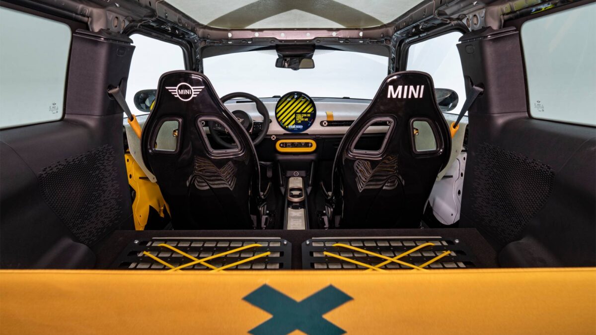 The Skeg是一台以衝浪文化為靈感的Mini JCW Electric,車身以鮮明的黃銀雙色呈現,半透明玻璃纖維外板成功減輕15%重量,同時強化空氣力學,最引人注目的設計是「Flex Tip Surf」後擾流翼,模仿衝浪板弧面,讓空氣流動轉化為下壓力。