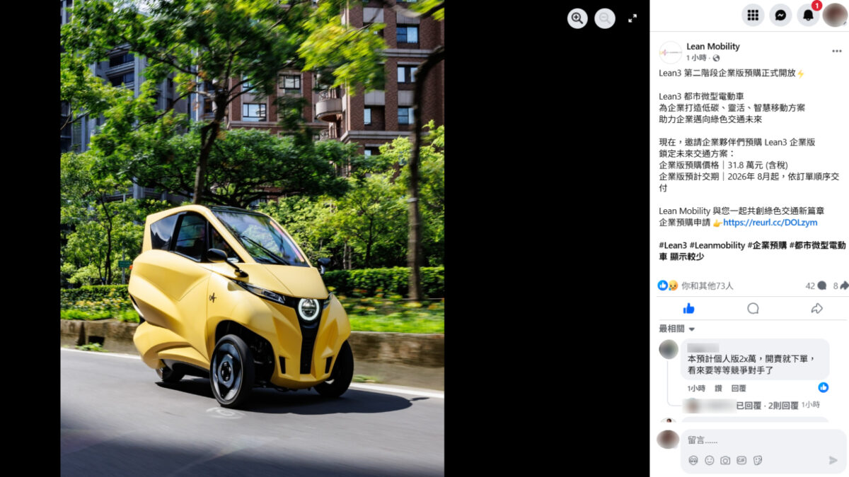 Lean Mobility第一波預購已經在8月中旬結束,而在這週早些時候,官方也已經發出公告Lean3即將啟動第二波預購程序。今天 (12日),Lean Mobility正式開啟Lean3企業版新一輪預購,仍舊針對企業夥伴先行推出,但接單價恢復新台幣31.8萬原價水準,預計明年8月就能夠交車。