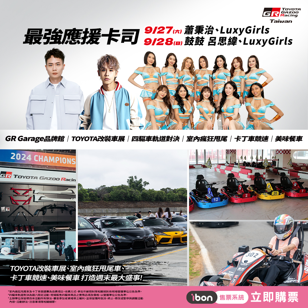 由Toyota總代理和泰汽車舉辦的Toyota Gazoo Racing Corolla Cup統一規格賽即將在9月27日、9月28日迎接首年賽季的最終站賽事,由素人車手為主的12位車手將在最後一戰力拚年度冠軍頭銜。和泰汽車更加碼現場活動,除了邀請創作歌手蕭秉治與跳歌手鼓鼓呂思緯現場演出,還將同步展出GR Yaris Rally2與TG-RR GR Yaris DAT兩款工廠賽車,甚至以Morizo匿名參與賽車運動的豐田章男會長也將再度來台,親自率領Rookie Racing車隊來台,並加碼統規賽加碼賽事Bonus Race。