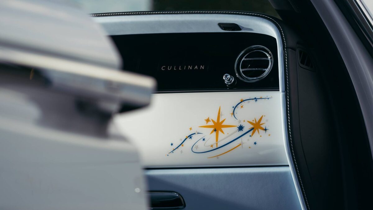 Cullinan Cosmos最矚目的設計,莫過於品牌首度推出的全手繪Starlight Headliner。這件劃時代的藝術品由內部藝術家耗時超過160小時,以自由手法完成。作品以銀河系為主題,呈現地球肉眼可見的星河與「宇宙雲霧」,為了營造縹緲的雲層質感,藝術家特別使用超過20層壓疊壓克力顏料,並出人意表地以「化妝刷」輕點顏料,使色彩能自然沉積,形成細緻的霧感,隨後再以針筆與飛濺技法繪製滿天星點,搭配傳統光纖燈孔,完成一幅栩栩如生的星河圖景,這幅天幕藝術不僅讓乘客抬頭即可望見銀河,更將每一次乘坐體驗轉化為「穿越星際的旅程」。