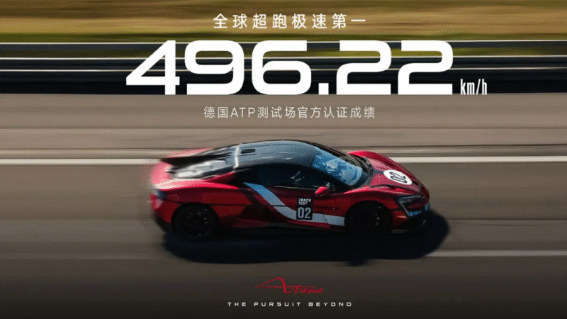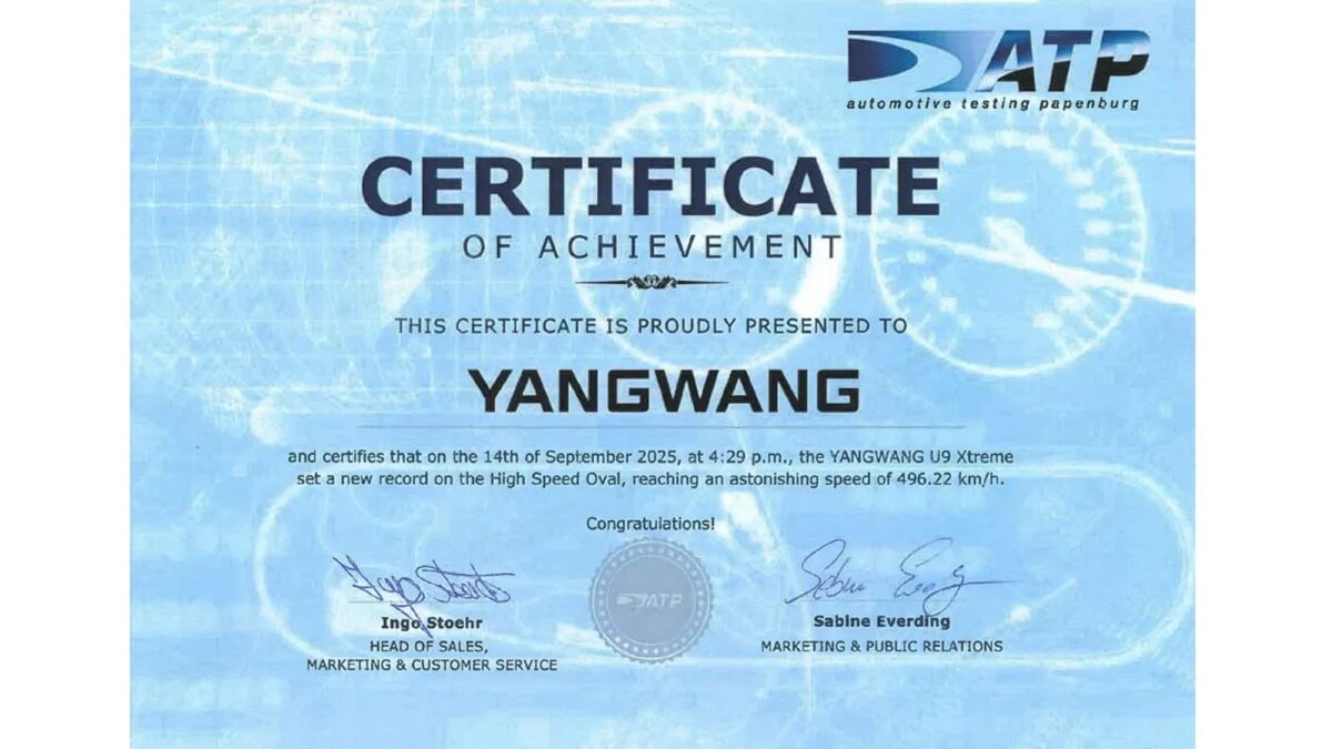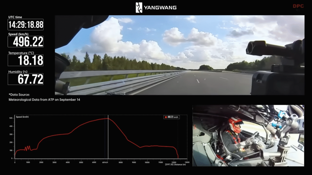 仰望U9 Xtreme選在在德國ATP Automotive Testing Papenburg測試賽道上進行測試,挑戰過程同樣驚心動魄。U9 Xtreme首先以300 km/h的高速繞過橢圓周回道,隨後全力加速突破450km/h,最終在長直線衝刺至496.22km/h,刷新世界紀錄。為了承受如此極速,輪胎也由專業供應商特製開發,能抵抗高達500 km/h的負荷。
