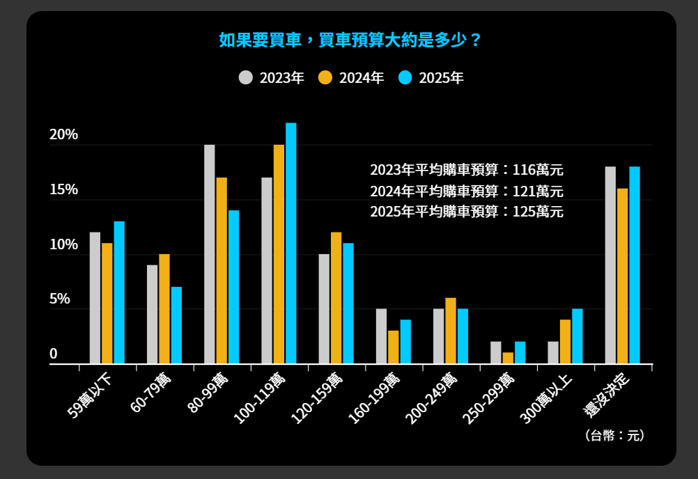 2025購車風向球調查顯示,有20%民眾會將買車預算控制在79萬元以下,14%預算在80~99萬間,22%表示預算為100~119萬元,預算在120~199萬元的比例合計為15%,而預算在200萬元以上的合計有12%,18%則是未決定。平均下來,2025購車預算來到125萬元,高於去年的121萬元,再比較2023年結果,前年116萬元的購車預算,今年度更是超出9萬元。