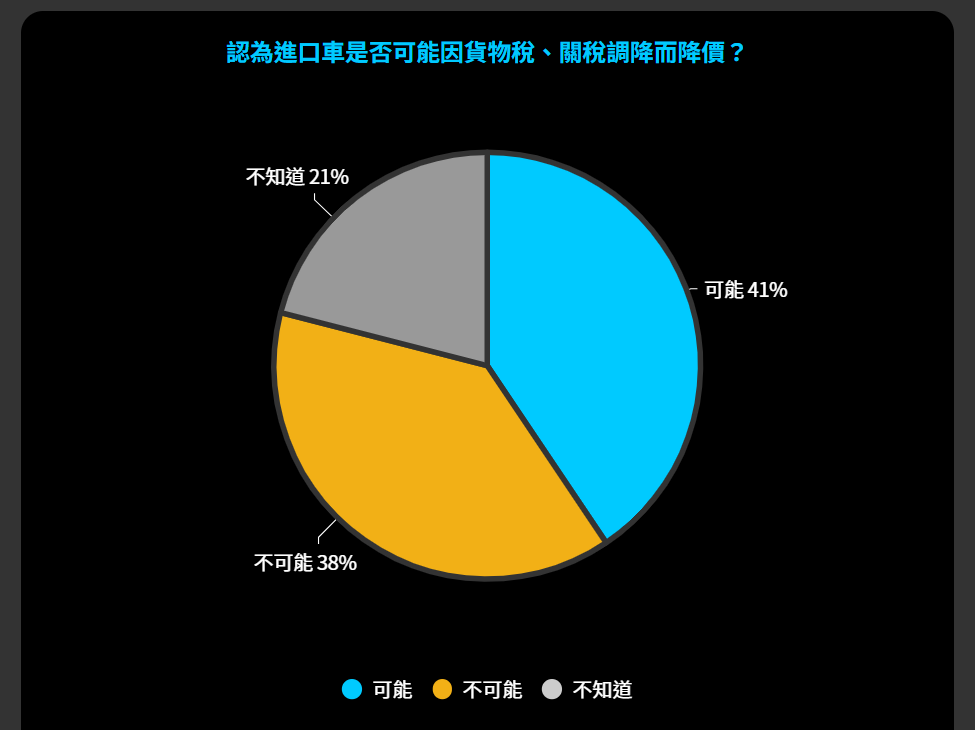 關稅政策不斷波動,部分民眾認為關稅數字可能牽動進口車售價,甚至影響貨物稅調整。民調結果中,41%民眾認為進口車會因為貨物稅或關稅調降而降價,但有38%民眾認為不可能,21%表示沒有意見。潛在車主中,48%認為進口車可能因為貨物稅或關稅調降而降價,37%認為不會。若是未來5年有購車計畫民眾,56%認為進口車會因此降價、34%不會。