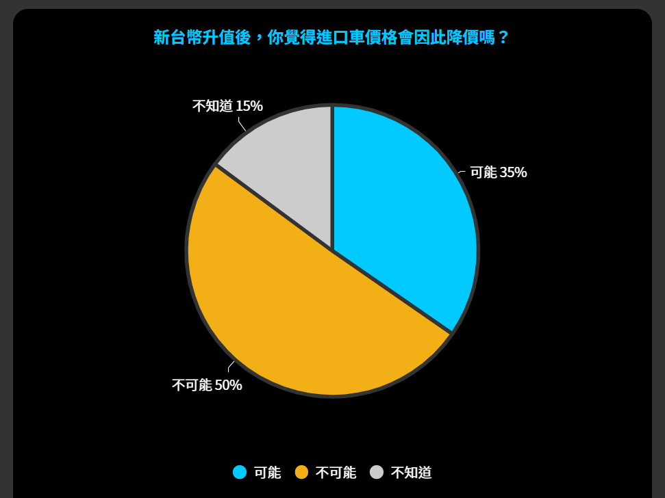 針對新台幣升值議題探討,近期新台幣升值,有民眾指出進口車售價可能受益。35%民眾認為進口車可能會因為新台幣升值而降價,51%認為不會因此降價,15%沒有意見。潛在車主中則有38%認為新台幣升值會致進口車降價,51%認為不會。
