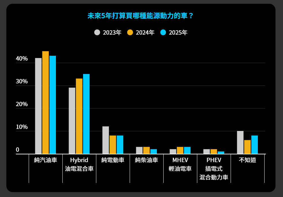 買車選擇燃油車仍是多數,Hybrid車款勝過電動車
