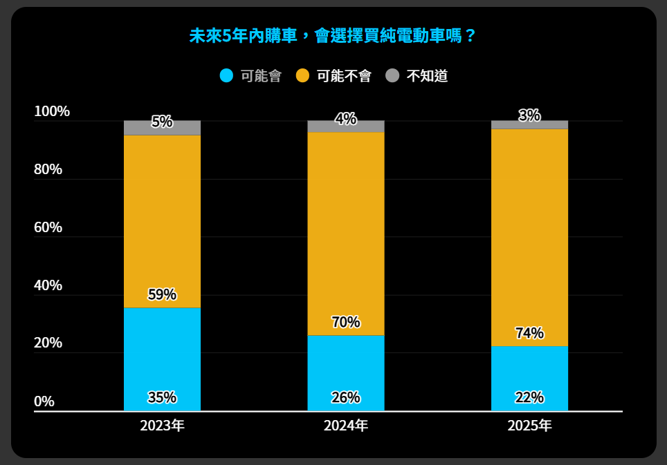 對於近5年有打算買車民眾,僅有22%民眾表示會選擇純電動車,但有74%的人都表示不會選擇電動車。交叉結果顯示,30~39歲民眾高過其他族群達29%,但50~60歲只有19%,發現年齡較高者對於電動車接受度較低。而且,月收入6萬元以上購買電動車比例超過月收入6萬元以下民眾,都將近3成,收入愈高似乎選擇電動車趨勢較明顯。