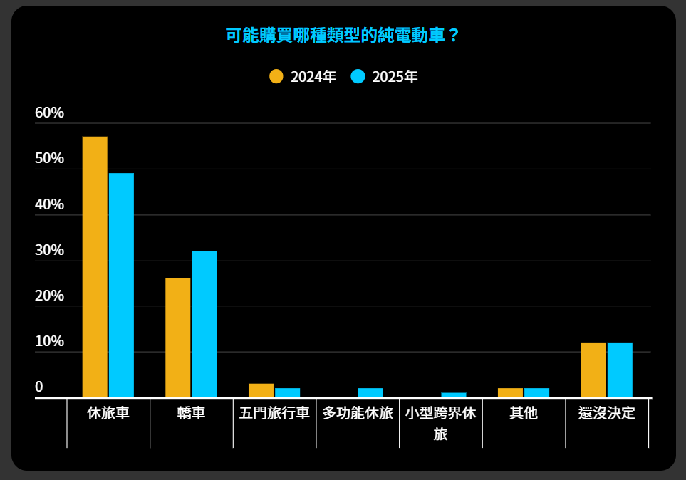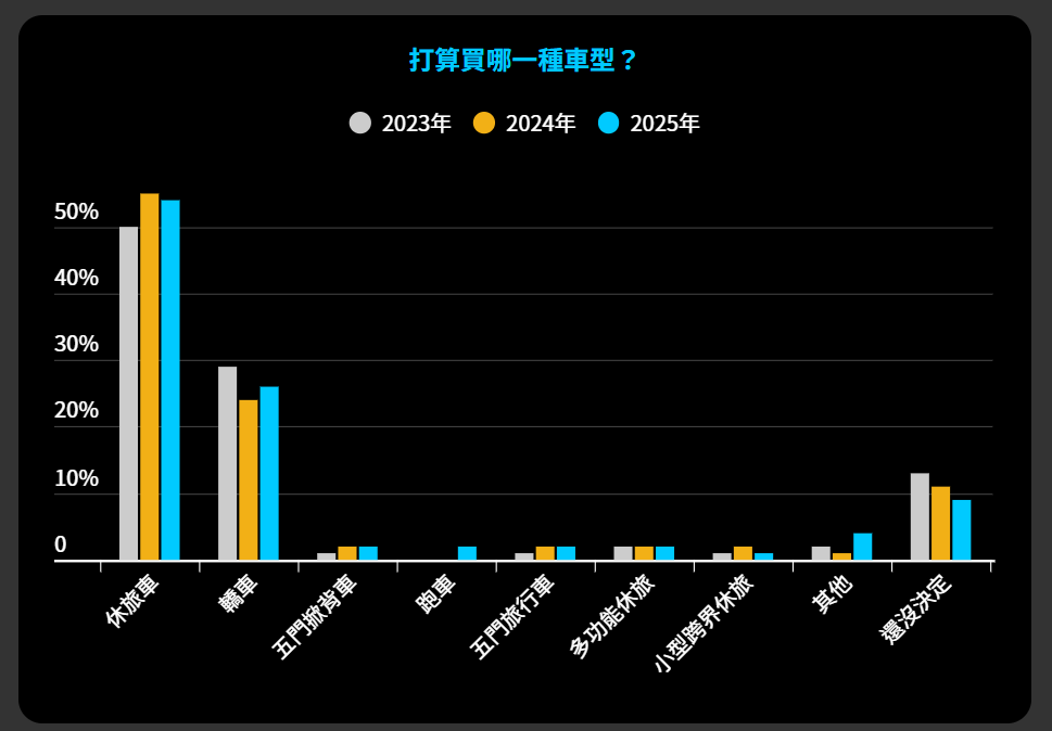 在整體受訪群眾中,考慮購買休旅車的比例超過半數、達54%,只有26%打算購買轎車,其他車型的購買比例則落在2%以下。若針對考慮購買電動車民眾訪問,雖然今年度數字略低於2024年的57%,但今年仍有將近半數49%會選擇電動休旅車,電動轎車為32%。因此,無論是整體購車取向,或是單一電動車購車考量,都顯示休旅車依舊是現今主流。