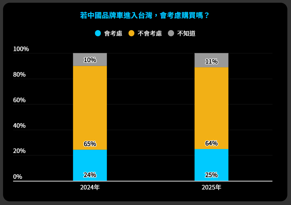 對於近期頗受關注的中國品牌汽車,若進入台灣市場,不考慮購買的比例與2024年持平,有64%民眾依舊不會購買(去年為65%),僅有25%會考慮購買中國品牌汽車,透露民眾對中國品牌車輛接受度仍有限。而且男性對中國品牌汽車接受度贏過女性,前者34%、後者17%。深入來看,年齡層愈高對中國品牌汽車接受度較為廣泛,40~49歲(28%)、50~60歲(30%)皆有三成左右,相比30~39歲只有22%、18~29歲19%明顯。