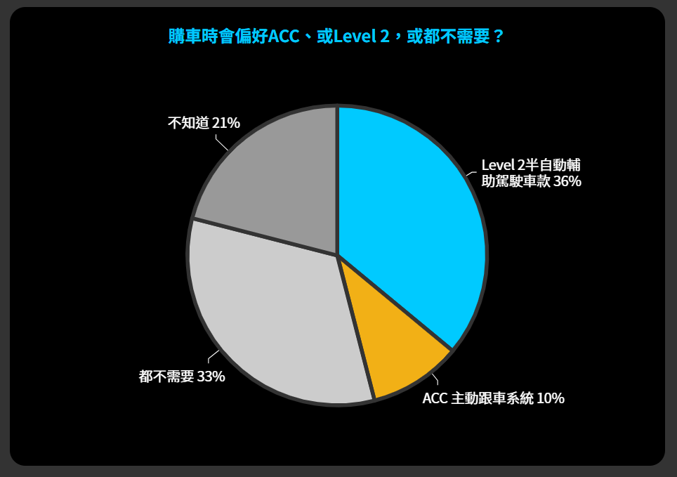 近年新車逐步搭載駕駛輔助系統,但對於新車是否需要搭載相關配備?有36%民眾表示會選擇配備Level 2半自動輔助駕駛車輛,10%民眾認為只要有ACC主動跟車系統即可,甚至有33%認為「不需要」,顯現民眾對駕駛輔助系統觀點不一。