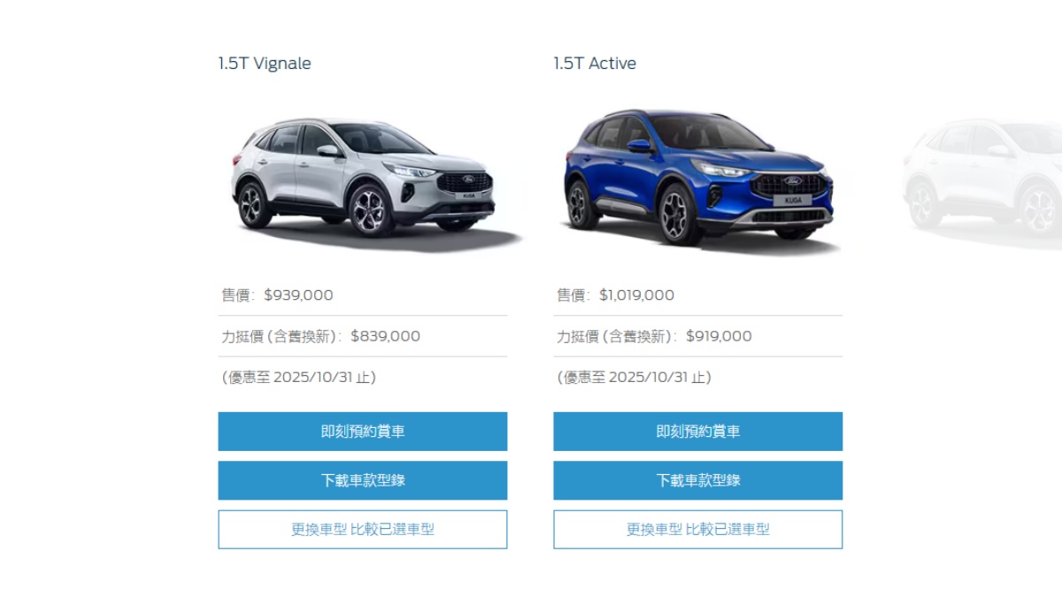 繼電動野馬休旅Mustang Mach-E因為現車完售,相關產品頁面從官網下架,國產休旅Kuga旗下 2.0T AWD ST-Line車型也步上相同的命運,目前福特官網上已經將這款搭載2.0升渦輪動力的四驅車型下架,只剩下1.5T Vignale、1.5T Active兩款搭載1.5升渦輪動力的前驅車型。同時為了刺激買氣,Ford總代理福特六和還特別針對這兩款1.5T車型加碼提供5萬元購車金,搭配舊換新補助,最高將能省下10萬元。