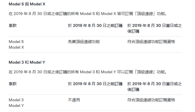 雖然台灣特斯拉宣布頂級連線功能即將收費,但官方仍有提到「兩款車」終身享有頂級連線功能,即為2019年8月30日之前訂購的Model S與Model X。認證中古車部分,只要是在2020年1月16日前購買符合資格車輛 (即上述Model S、X),同樣享有終身頂級連線。台灣特斯拉強調,現在Model S與Model X自交車起仍有頂級連線一年免費試用,Model 3與Model Y則有30天免費試用資格。