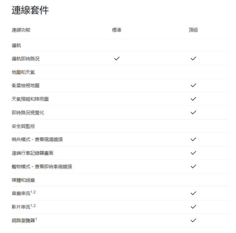 | 包含導航、手機 App 遙控、OTA 更新、自動輔助駕駛等核心功能,所有車主皆可使用。 | 更豐富的數位體驗。包括影音與音樂串流、衛星地圖、即時路況視覺化、哨兵模式以及車內網頁瀏覽器 |